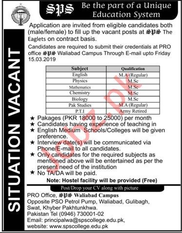 SPS College Waliabad Campus Swat Jobs 2019 for Teachers