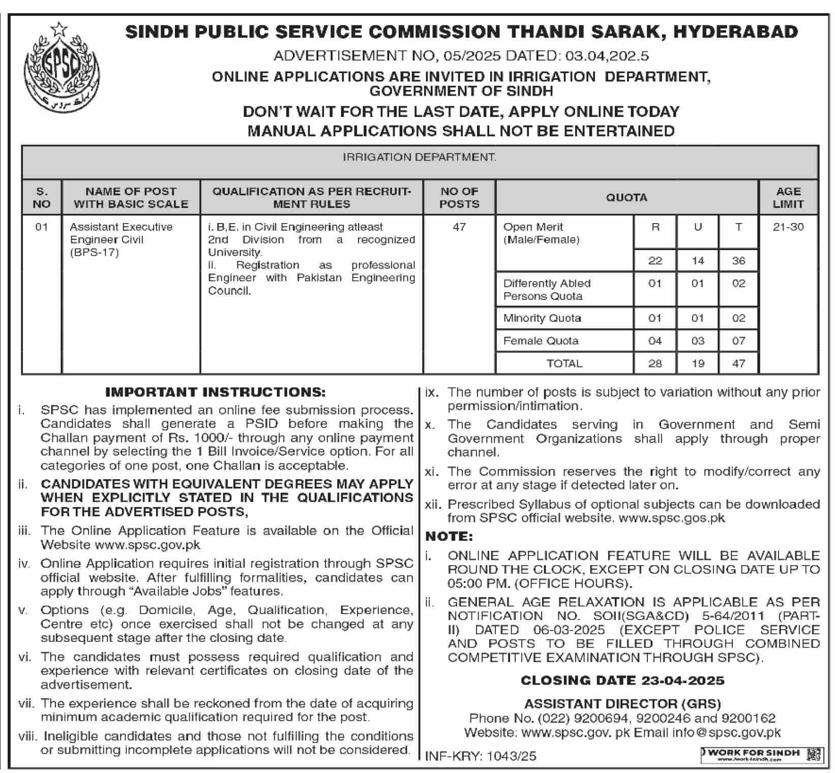 SPSC Sindh Public Service Commission latest Government Engineering jobs and others can be applied till 23 April 2025 or as per closing date in newspaper ad. Read complete ad online to know how to apply on latest SPSC Sindh Public Service Commission job opportunities.