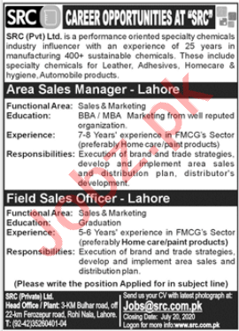 SRC Lahore Jobs 2020 for Area Sales Manager & Sales Officer