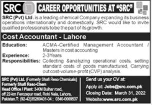 Vacant posts including cost accountant are announced in SRC Pvt Limited Lahore, lahore Punjab Pakistan as per 27 March 2022 advertisement in daily Jang Newspaper. Persons with M.com, Bachelor, B.com and Master etc. education can apply.