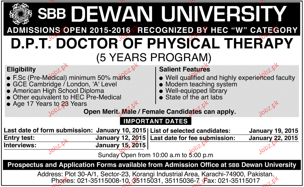 SSb Dewan University Admission in DPT in Karachi. Read newspaper ad for exact details.