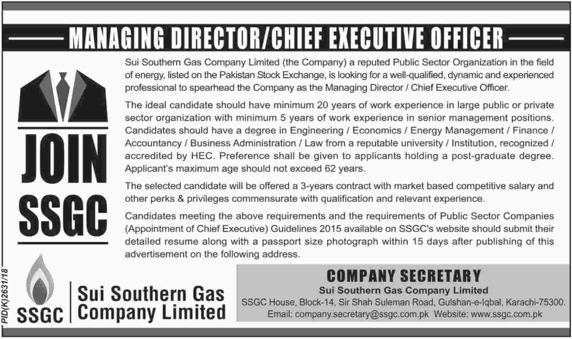 SSGC Jobs 2018 For Managing Director
