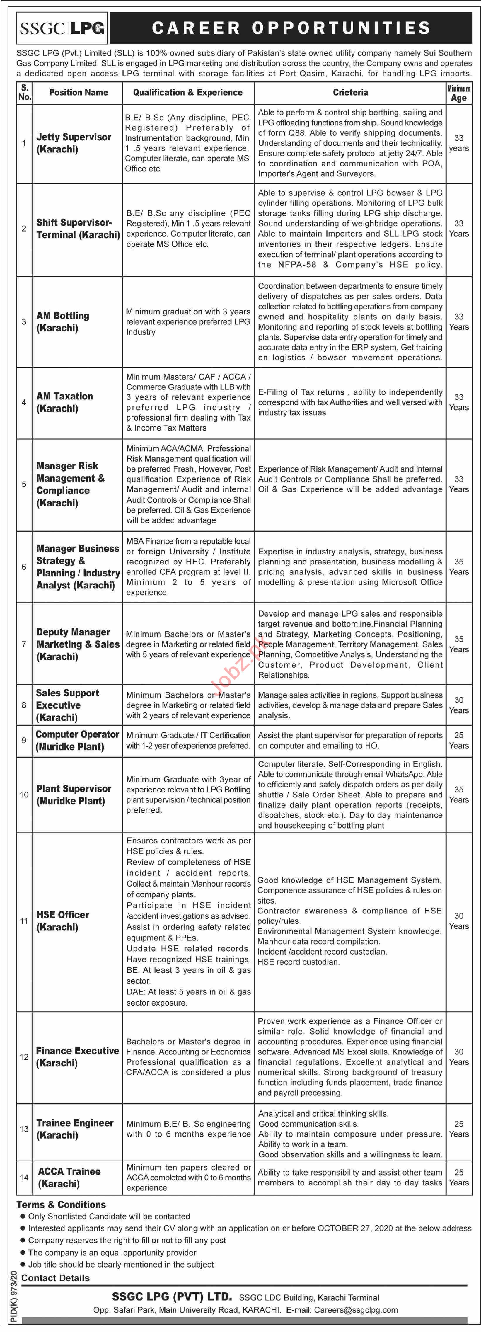 Vacancies in SSGC LPG Pvt Limited Advertisement October 2020