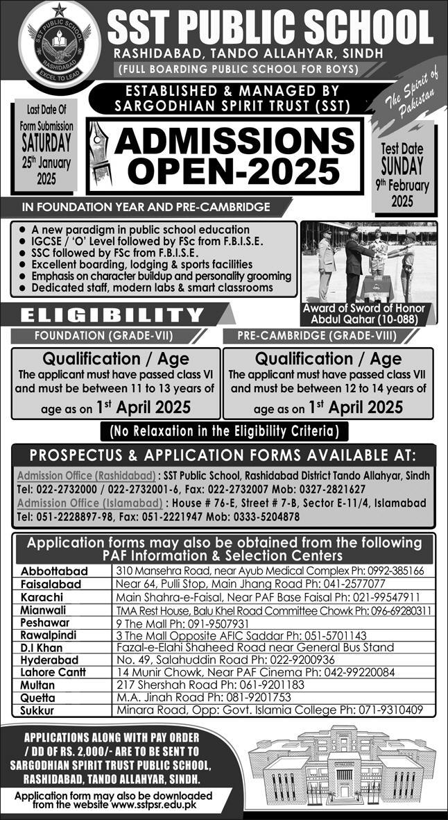 Admissions in Sargodhian Spirit Trust SST Public School Rashidabad 2024 for Grade 8, Matric, Intermediate Program has been announced. Sargodhian Spirit Trust SST Public School Rashidabad Tando Allahyar Sindh Pakistan welcomes students to apply for admissions in academic year 2024 in Teaching College. Eligible candidates for admissions in Middle, Matric and Intermediate can apply as per Private institute criteria and before closing date 25 January 2025 after reading advertisement online. Read newspaper ad for exact details.