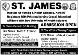 ST James Institute of Nursing & Health Sciences affiliated with Dow University of Health Sciences is offering admissions in Generic BS Nursing and Post RN BSN in Karachi. Read newspaper ad for exact details.