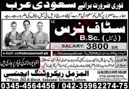 Vacant posts including staff nurse are announced in Al Muzamil Recruiting Agency Riyadh, riyadh Saudi Arabia as per 23 June 2024 advertisement in daily Express Newspaper. Educational qualifications required Matric etc.