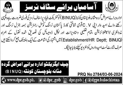 Balochistan Institute of Nephro Urology BINUQ invites applications for job positions advertised in daily Express dated 4 June 2024 for following vacancies in Quetta, quetta Balochistan Pakistan.
