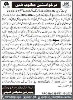 Director General Health Services jobs advertisement dated about 18 December 2024 in daily Jang Newspaper invites application for the vacant post of staff nurse in Quetta, quetta Balochistan Pakistan. Preferred Education is Others, Matric and Intermediate etc.