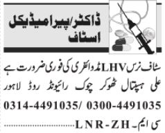 Ali Hospital Lahore, lahore Punjab Pakistan invites applications from eligible candidates for the post of nurse, lhv and staff nurse as per advertisement of June 11, 2024 published in daily Jang Newspaper. Preferred Education is Intermediate and Matric etc.