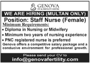 Genova IVF & Fertility Centre jobs advertisement dated about 17 December 2025 in daily Jang Newspaper invites application for the vacant post of female staff nurses in Multan, multan Punjab Pakistan. Educational qualifications required Others and Intermediate etc.