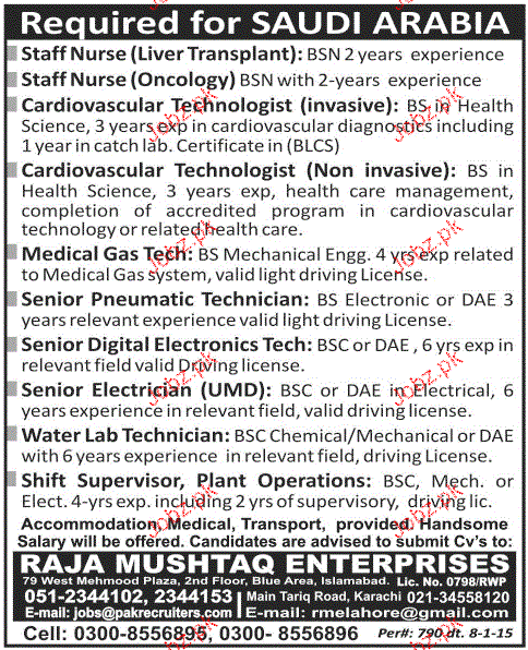 Staff Nurses, Technologist, Senior Electricians Wanted