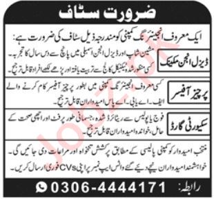 Engineering Company Lahore, lahore Punjab Pakistan invites applications from eligible candidates for the post of diesel engine mechanic, purchase officer and security guard as per advertisement of July 20, 2025 published in daily Jang Newspaper. Candidates with Matric, BA, Bachelor, Others and Intermediate etc. educational background will be preferred.