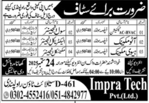 Impra Tech jobs advertisement dated about 22 September 2025 in daily Jang Newspaper invites application for the vacant post of auto mechanic, civil engineer, ac hvac technician, mechanical engineer, electrical engineer and heavy mechanic in Lahore, lahore Punjab Pakistan. DAE etc. educational qualification will be preferred.