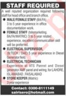 Private Company jobs advertisement dated about 9 July 2023 in daily Jang Newspaper invites application for the vacant post of female staff, store keeper, electrical supervisor, male staff and electrical technician in Lahore, lahore Punjab Pakistan. Educational qualifications required Matric, Bachelor and Intermediate etc.