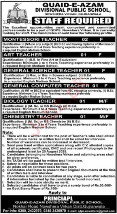 Quaid e Azam Divisional Public School Nowshera Road Gujranwala, gujranwala Punjab Pakistan invites applications from eligible candidates for the post of chemistry teacher, biology teacher, montessori teacher, general science teacher, general computer teacher and art teacher as per advertisement of August 11, 2025 published in daily Daily Pakistan Newspaper. Persons with MA, M.sc, MS, Master and Bachelor etc. education can apply.