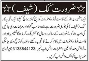 Restaurant is looking for candidates for following posts as per job advertisement published in daily Jang Newspaper of July 15, 2025 for location Quetta, quetta Balochistan Pakistan:
