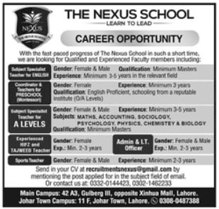 The Nexus School jobs advertisement dated about 3 August 2025 in daily Jang Newspaper invites application for the vacant post of subject specialist teacher, sports teacher, coordinator, admin it officer, tajweed teacher, subject specialist teacher for a levels and teachers for preschool in Johar Town Lahore, lahore Punjab Pakistan. Candidates with MS, Master and Bachelor etc. educational background will be preferred.