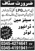 LPG Marketing Company Gujranwala, gujranwala Punjab Pakistan invites applications from eligible candidates for the post of salesman, driver and loader as per advertisement of December 8, 2025 published in daily Jang Newspaper. Educational qualifications required Matric, Middle and Intermediate etc.