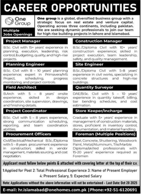Vacant posts including Procurement Officers, Site Engineer, Field Architect, Project Coordinator, Quantity Surveyor, Incharge, Store Keeper, Construction Manager, Planning Engineer, Project Manager and Foreman are announced in Private Company Lahore, lahore Punjab Pakistan as per 13 October 2025 advertisement in daily Jang Newspaper. Candidates with DAE, Others and Bachelor etc. educational background will be preferred.
