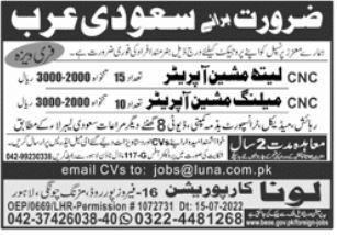 Luna Corporation Riyadh, riyadh Saudi Arabia invites applications from eligible candidates for the post of lathe machine operator and mailing machine operator as per advertisement of July 17, 2022 published in daily Jang Newspaper. Preferred Education is Middle and Matric etc.