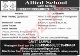Allied Schools is looking for candidates for following posts as per job advertisement published in daily Jang Newspaper of June 30, 2025 for location Shams Colony Islamabad, islamabad Islamabad Pakistan: