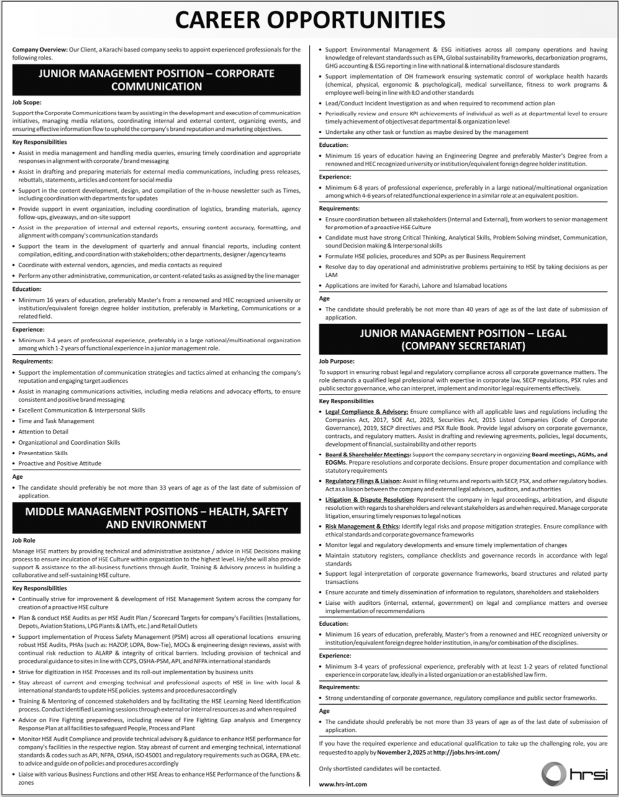 Human Resource Solution International HRSI jobs advertisement dated about 19 October 2025 in daily Jang Newspaper invites application for the vacant post of jr management position legal company secretary, middle management positions health safety environment, hr management position and corporate communication in Karachi, karachi Sindh Pakistan. Bachelor and Master etc. educational qualification will be preferred.