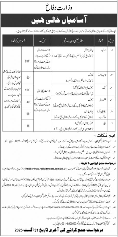 Vacant posts including cook, mali, driver, naib qasid, khakroob, mess waiter and sanitary worker are announced in Ministry of Defence Islamabad, islamabad Islamabad Pakistan as per 10 August 2025 advertisement in daily Jang Newspaper. Middle, Matric and Primary etc. educational qualification will be preferred.