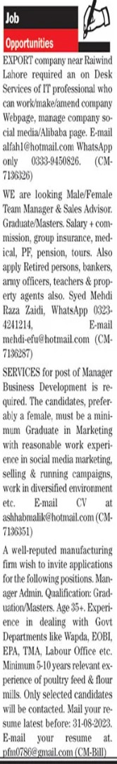 Private Company jobs advertisement dated about 29 August 2023 in daily The News Newspaper invites application for the vacant post of it professional, manager, sale advisor and team manager in Lahore, lahore Punjab Pakistan. Educational qualifications required Matric, Bachelor, B.com, Master, M.com and Intermediate etc.