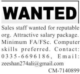 Vacant posts including female staff, male staff and sales staff are announced in Private Company Lahore, lahore Punjab Pakistan as per 15 December 2023 advertisement in daily Jang Newspaper. Candidates with Middle, Intermediate and Matric etc. educational background will be preferred.