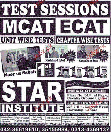 Star Institute Admission in MCAT and ECAT in Lahore. Read newspaper ad for exact details.
