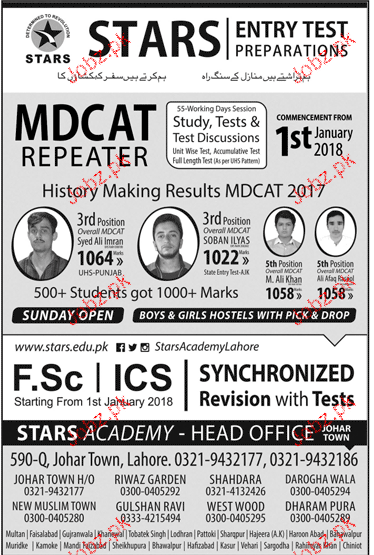 Stars Academy Admission in Entry Test Preparation MDCAT in Lahroe. Commencement of Classes from 1st January 2018Sunday will be remain open. Boys and Girls Hostel available. Read newspaper ad for exact details.
