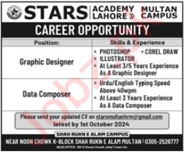 Stars Academy invites applications for job positions advertised in daily Jang dated 22 September 2024 for following vacancies in Multan, multan Punjab Pakistan.