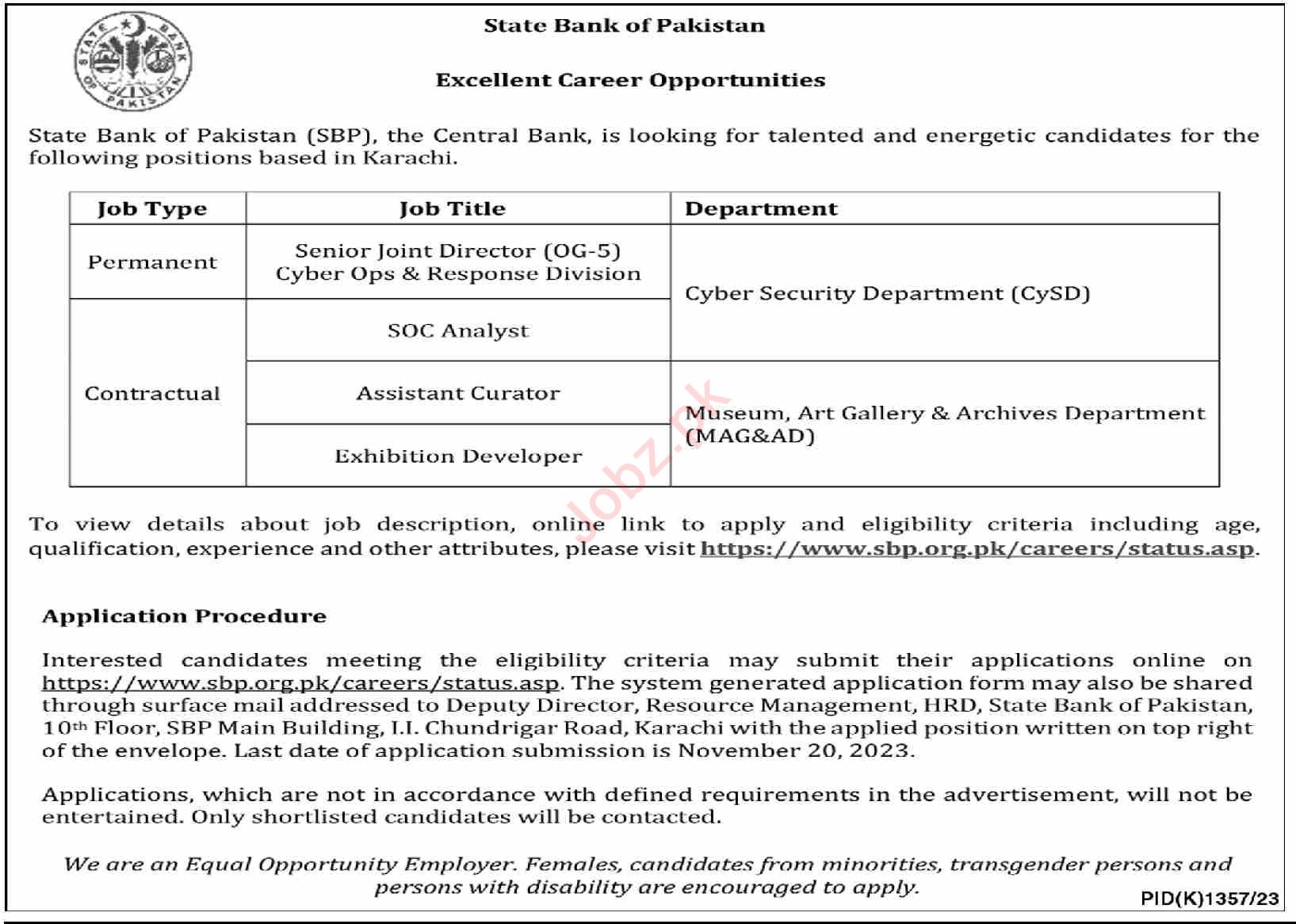 Vacant posts including soc analyst, assistant curator, exhibition developer and joint director cyber ops response division are announced in State Bank of Pakistan SBP Karachi, karachi Sindh Pakistan as per 5 November 2023 advertisement in daily Dawn Newspaper. Candidates with MS, BBA, Master, MBA and Bachelor etc. educational background will be preferred.