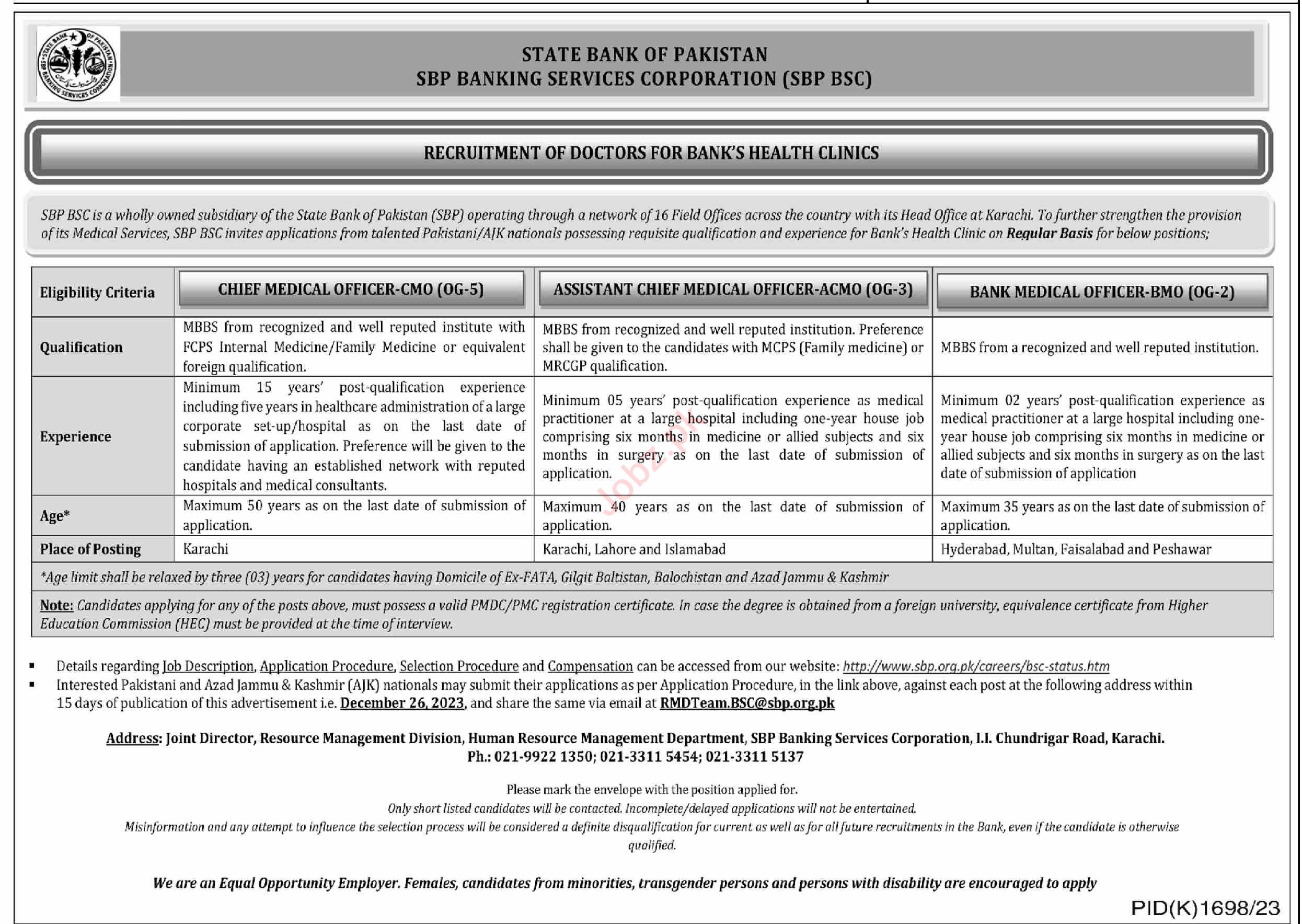 State Bank of Pakistan SBP jobs advertisement dated about 10 December 2023 in daily Dawn Newspaper invites application for the vacant post of chief medical officer cmo and assistant chief medical officer in Karachi, karachi Sindh Pakistan. Educational qualifications required Master, MS and Bachelor etc.