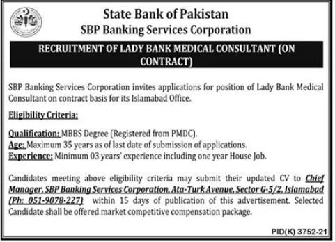 State Bank Of Pakistan SBP Lady Medical Consultant Jobs 2022