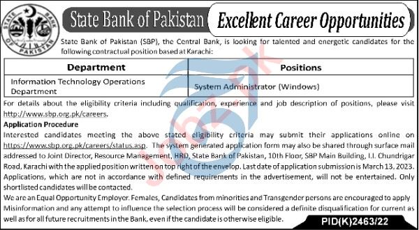 State Bank of Pakistan SBP System Administrator Jobs 2023