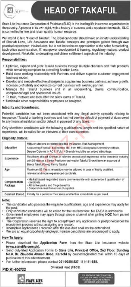 Vacancies in State Life Insurance Corporation of Pakistan Advertisement September 2022