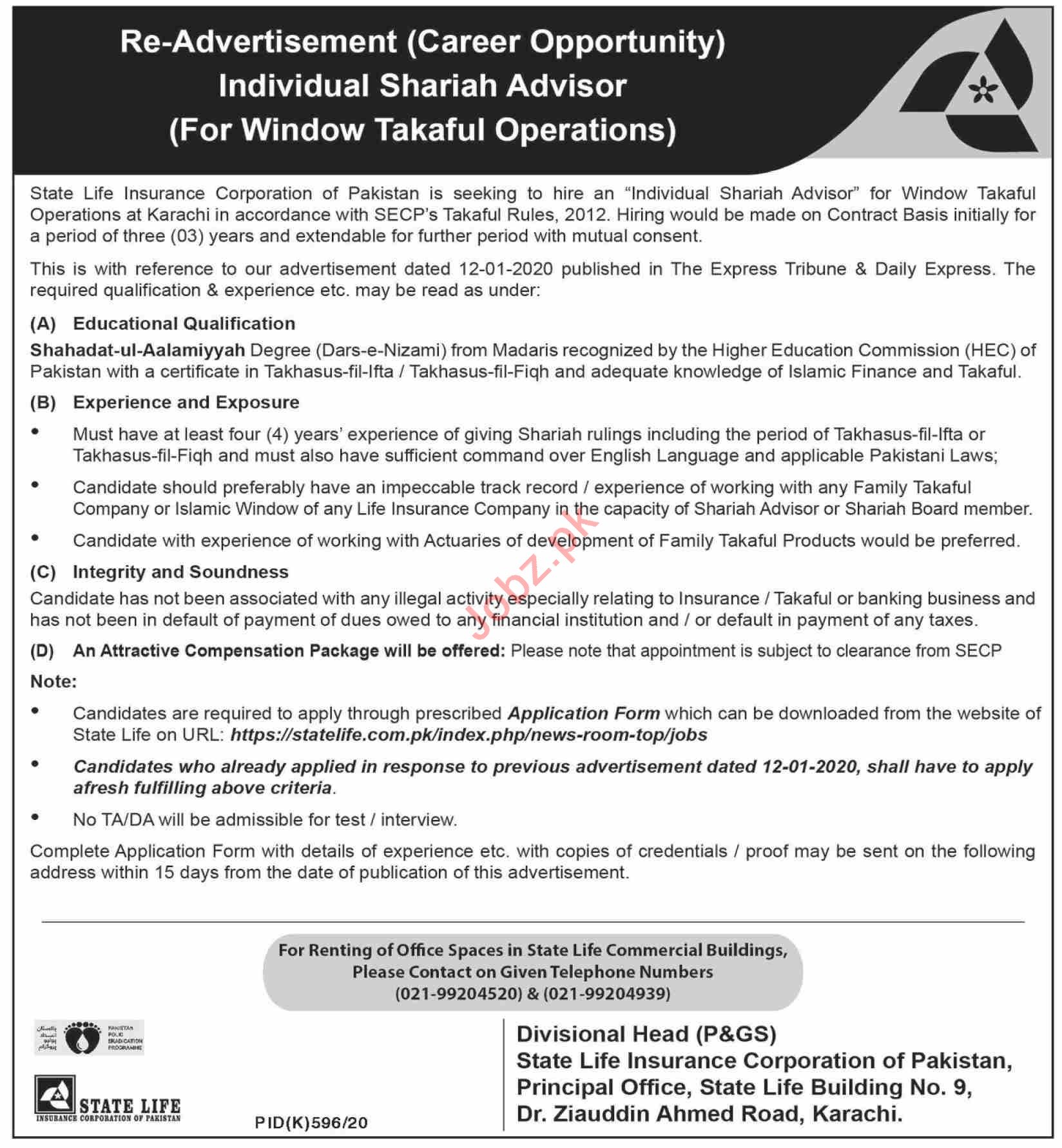 State Life Insurance Karachi Jobs 2020 For Shariah Advisor