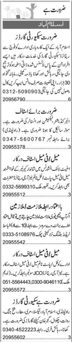 Vacant posts including security guard, state life insurance staff, ac installer, ac technician and male female staff are announced in Private Company Islamabad, islamabad Islamabad Pakistan as per 28 December 2024 advertisement in daily Express Newspaper. Persons with Middle, Matric, Bachelor, Intermediate and Master etc. education can apply.