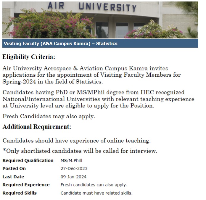 Latest Government jobs in Air University in Teaching and others can be applied till 9 January 2024 or as per closing date in newspaper ad. Read complete ad online to know how to apply on latest Air University job opportunities.