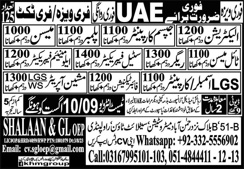 SHALAAN & GL Overseas Employment Promoters jobs advertisement dated about 8 August 2023 in daily Express Newspaper invites application for the vacant post of gypsum carpenter, plumber, mason, lgs machine operator, lgs assembler, ws machine operator, fiber technician, carpenter, tile mason, electrician, rigger, steel fabricator and aluminum fabricator in Sharjah, abu dhabi UAE. Preferred Education is Intermediate, Matric and DAE etc.