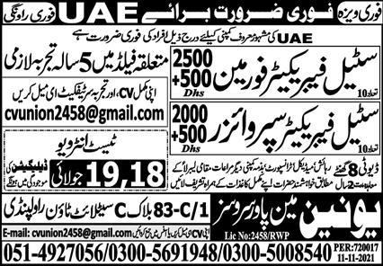 Union Manpower Services invites applications for job positions advertised in daily Express dated 15 July 2022 for following vacancies in Sharjah, abu dhabi UAE.