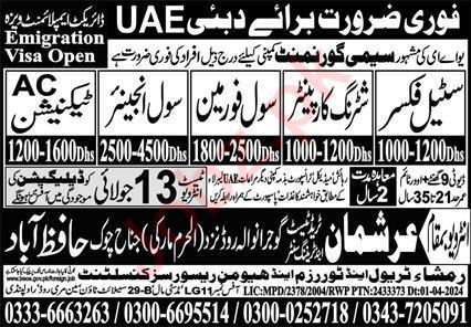 Rimsha Travels Tourism & Human Resources Consultant is looking for candidates for following posts as per job advertisement published in daily Express Newspaper of July 7, 2024 for location UAE, dubai UAE: