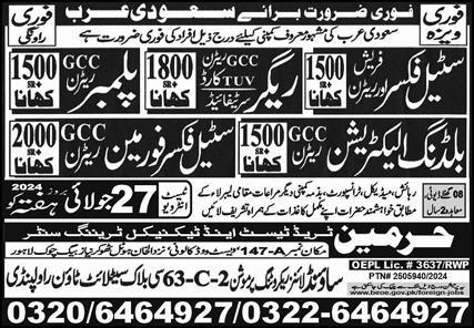 Sound Lines Recruiting Promotion Riyadh, riyadh Saudi Arabia invites applications from eligible candidates for the post of steel fixer foreman, plumber, steel fixer, rigger and building electrician as per advertisement of July 24, 2024 published in daily Express Newspaper. Candidates with Middle and Matric etc. educational background will be preferred.