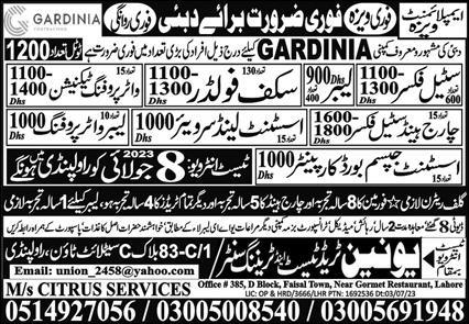 Vacant posts including assistant land surveyor, assistant gypsum board carpenter, water proofing technician, labor water proofing, steel fixer, scaffolder, labor and charge hand steel fixer are announced in Citrus Services Overseas Employment Promoters UAE, dubai UAE as per 5 July 2023 advertisement in daily Express Newspaper. Educational qualifications required Matric, Middle and Intermediate etc.