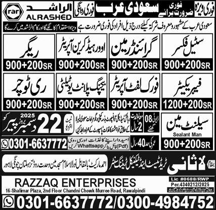 Latest Overseas jobs in Razzaq Enterprises in Labor and others can be applied till 22 December 2025 or as per closing date in newspaper ad. Read complete ad online to know how to apply on latest Razzaq Enterprises job opportunities.