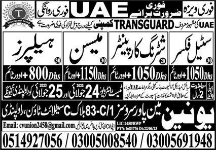 Union Manpower Services UAE, abu dhabi UAE invites applications from eligible candidates for the post of steel fixer, shuttering carpenter, mason and helper as per advertisement of July 23, 2023 published in daily Express Newspaper. Matric, Middle and Primary etc. educational qualification will be preferred.