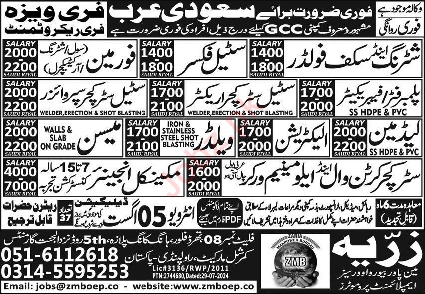 Zaria Manpower Bureau Overseas Employment Promoter jobs advertisement dated about 4 August 2024 in daily Express Newspaper invites application for the vacant post of steel fixer, mechanical engineer, shuttering skiff folder, mason, electrician, plumber, fabricator, foreman and welder in Makkah, makkah Saudi Arabia. Preferred Education is Middle, Matric, DAE, B.E and Primary etc.