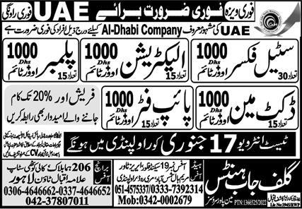Vacant posts including electrician, steel fixer, duct man, plumber and pipe fitter are announced in Gulf Job Hunts Manpower Services Abu Dhabi, abu dhabi UAE as per 16 January 2023 advertisement in daily Express Newspaper. Persons with Middle etc. education can apply.