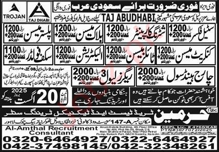 Harmain Trade Test & Technical Training Center jobs advertisement dated about 18 August 2025 in daily Express Newspaper invites application for the vacant post of Chargehand Civil, Electrician, Tiles Mason, Steel Fixer, Rigger, Block Mason, Shuttering Carpenter, Scaffolder, Concrete Mason and Plaster Mason in Riyadh, riyadh Saudi Arabia. Candidates with Matric, Primary and Middle etc. educational background will be preferred.